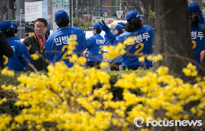 (서울=포커스뉴스) 20대 총선 공식선거 운동이 시작된 31일 오전 서울 장안동사거리에서 민병두 더불어민주당 동대문을 후보 선거운동원들이 지지를 호소하고 있다.