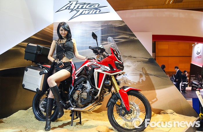 (서울=포커스뉴스) 31일 오전 서울 강남구 코엑스 D홀에서 열린 '2016 서울 모터사이클쇼' 에 참여한 혼다 부스의 한 모델이 아프리카 트윈 앞에서 포즈를 취하고 있다.