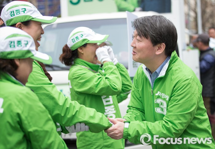 (서울=포커스뉴스) 총선 선거운동이 공식적으로 시작된 31일 오후 안철수 국민의당 상임공동대표가 서울 영등포구 여의도백화점 앞에서 김종구 영등포을 후보 지원 유세를 하던 중 선거운동 봉사자들과 인사를 나누고 있다.