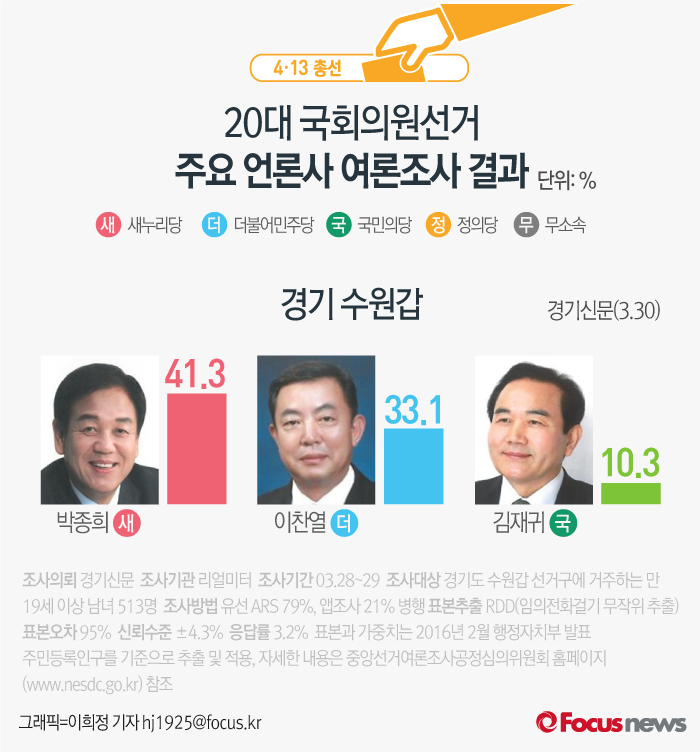 (서울=포커스뉴스) 경기신문이 리얼미터에 의뢰해 30일 발표한 여론조사 결과에 따르면 새누리당 박종희 후보의 지지율은 41.3%, 더불어민주당 이찬열 후보의 지지율은 33.1%, 국민의당 김재귀 후보는 10.3%를 기록했다.