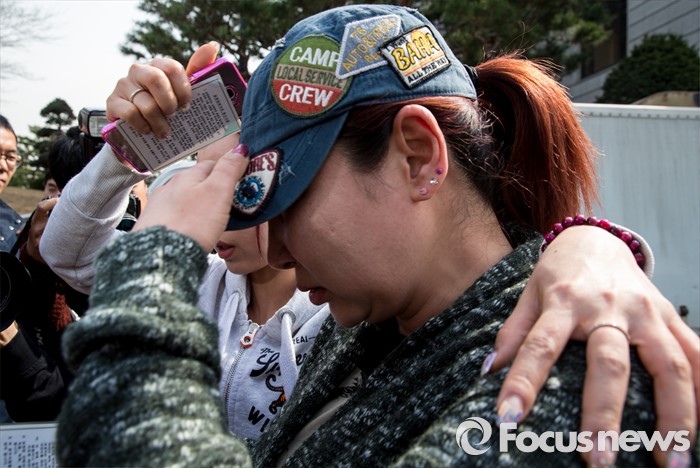 (서울=포커스뉴스) 헌법재판소의 자발적 성매매 처벌 규정 합헌 결정이 내려진 23일 오후 서울 재동 헌법재판소 앞에서 한터 관계자가 기자회견 후 눈물을 흘리고 있다.