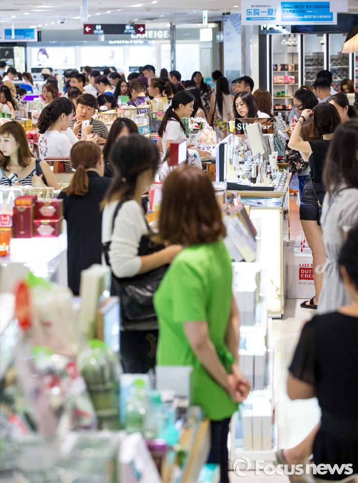 매출액을 보면 우리나라 면세점은 최근 10년간 연 15.1% 성장했다. 지난해 매출액은 약 9조2000억원으로 세계 1위 수준을 나타냈다.(서울=포커스뉴스) 서울 중구 남대문로 롯데면세점 외국인광관객. 2015.08.21 강진형 기자