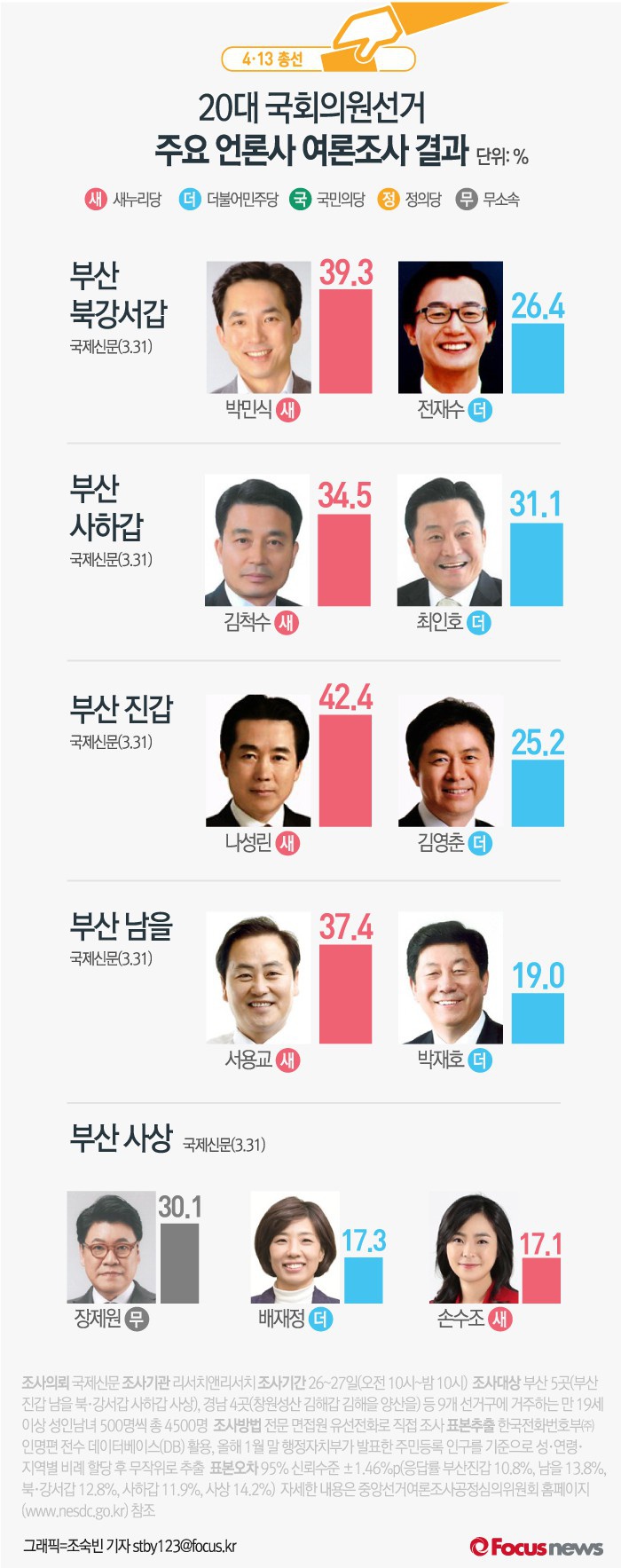 국제신문이 여론조사기관 리서치&리서치에 의뢰해 31일 발표한 결과에 따르면 새누리당이 북·강서갑, 부산진갑, 남을에서 더불어민주당을 앞섰다. 세 지역구는 각각 박민식 후보(39.3%), 나성린 후보(42.4%), 서용교 후보(37.4%)가 출마했다.