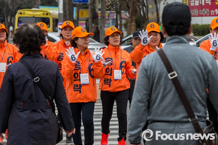 (대구=포커스뉴스) 31일 오후 대구 북구 칠곡네거리에서 무소속 대구 북구을 홍의락 후보 선거운동원이 지역주민들에게 한표를 호소 하고 있다.