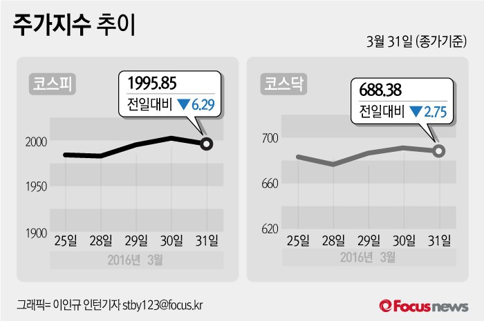 (서울=포커스뉴스) 31일 코스피지수는 전날 보다 0.31%(6.29포인트) 내린 1995.85에 장을 마쳤다. 코스닥지수는 전일 대비 0.40%(2.75포인트) 내린 688.38에 마감했다.