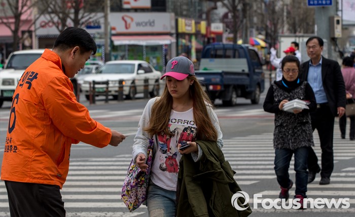 (대구=포커스뉴스) 무소속 대구 북구을 홍의락 후보가 31일 오후 대구 북구 칠곡네거리에서 유권자들에게 한 표를 호소 하고 있다.