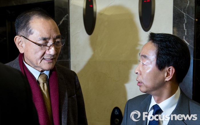 | △ 김효재 전 청와대 정무수석과 대화 나누는 김현철 전 부소장 |