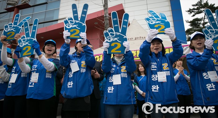 (안산=포커스뉴스) 20대 총선 공식선거 운동이 시작된 31일 오후 경기도 홈플러스 안산고잔점 앞에서 열린 더불어민주당 안산 집중유세에 참여한 선거운동원들이 지지를 호소하고 있다.