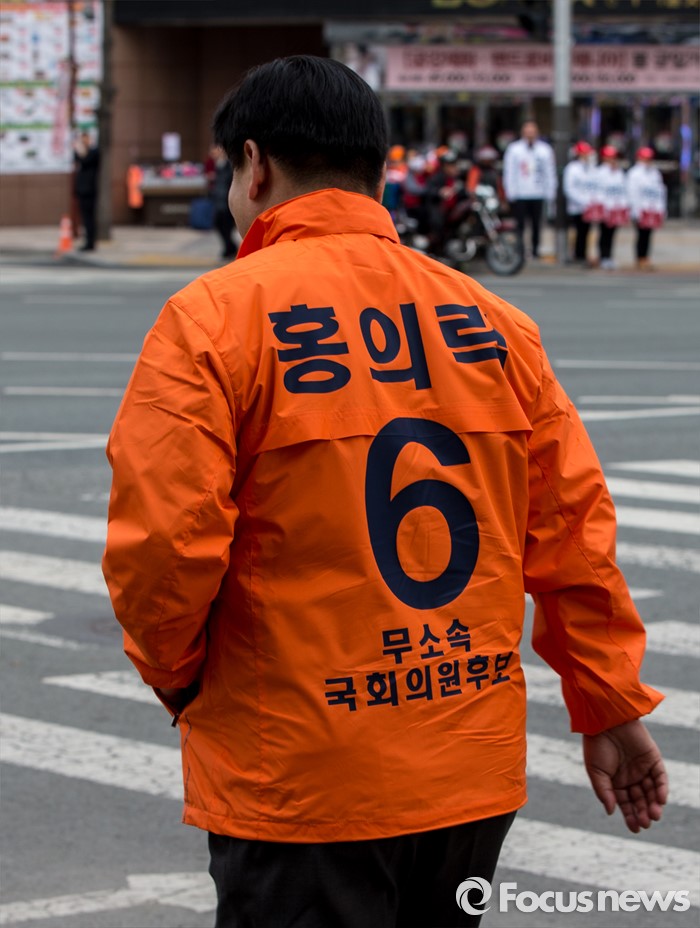 (대구=포커스뉴스) 무소속 대구 북구을 홍의락 후보가 31일 오후 대구 북구 칠곡네거리에서 유권자들에게 한 표를 호소 하고 있다.