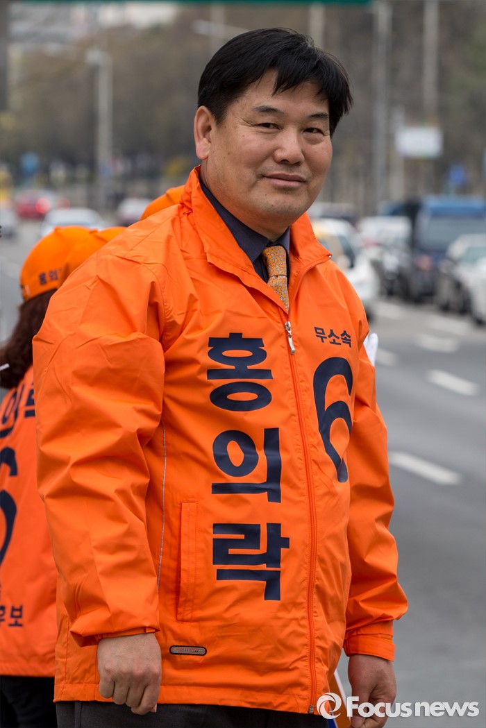 (대구=포커스뉴스) 무소속 대구 북구을 홍의락 후보가 31일 오후 대구 북구 칠곡네거리에서 유권자들에게 한 표를 호소 하고 있다.