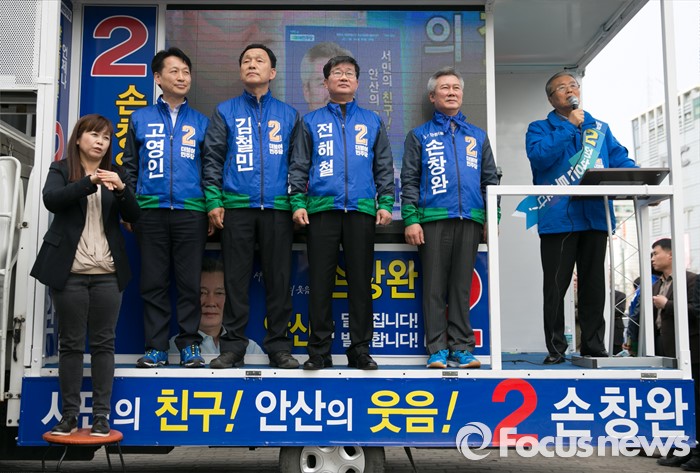 (안산=포커스뉴스) 20대 총선 공식선거 운동이 시작된 31일 오후 경기도 홈플러스 안산고잔점 앞에서 열린 더불어민주당 안산 집중유세에 참석한 김종인 비대위 대표 겸 선대위원장이 지지를 호소하고 있다. 오른쪽부터 김 대표, 손창완 단원을, 전해철 상록갑, 김철민 상록을, 고영인 단원갑 후보.