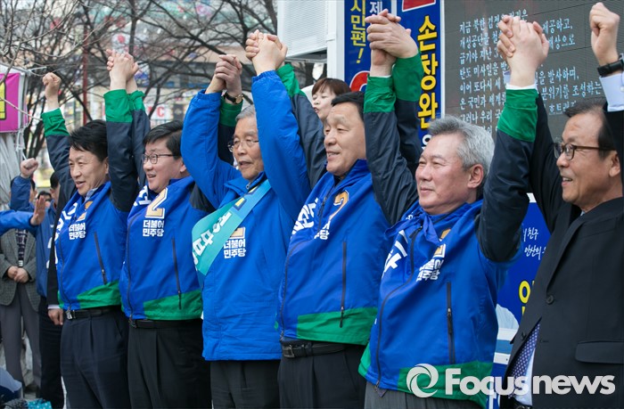 (안산=포커스뉴스) 20대 총선 공식선거 운동이 시작된 31일 오후 경기도 홈플러스 안산고잔점 앞에서 열린 더불어민주당 안산 집중유세에 참석한 김종인 비대위 대표 겸 선대위원장과 후보들이 취재진을 향해 포즈를 취하고 있다. 오른쪽부터 원혜영 경기 부천오정구, 손창완 안산 단원을, 김철민 상록을 후보, 김 대표, 전해철 상록갑, 고영인 단원갑 후보.