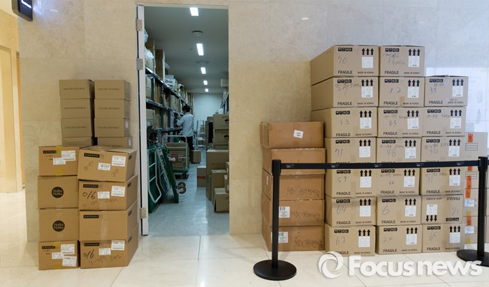(서울=포커스뉴스) 중국 아오란 그룹 임직원들이 서울 용산구 신라아이파크면세점을 찾은 31일 오후 면세점 물류창고에 평소보다 많은 상품들이 쌓여있다.