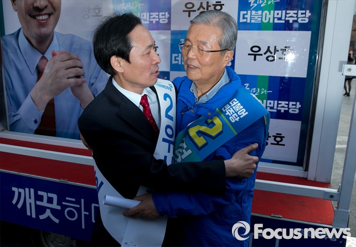 (서울=포커스뉴스) 20대 총선 공식선거 운동이 시작된 31일 오후 서울 신촌 유플렉스 앞에서 김종인(오른쪽) 더불어민주당 비대위 대표 겸 선대위원장이 우상호 서대문갑 후보의 지지를 호소한 뒤 우 후보와 포옹하며 포즈를 취하고 있다.