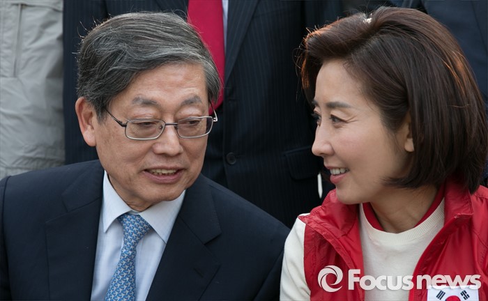 (서울=포커스뉴스) 4.13 총선 공식선거운동이 시작된 31일 오후 서울 서대문구 독립문공원에서 김황식(왼쪽) 전 총리와 나경원(오른쪽) 새누리당 의원이 이성헌 서대문갑 후보 출정식에 참석해 대화하고 있다.