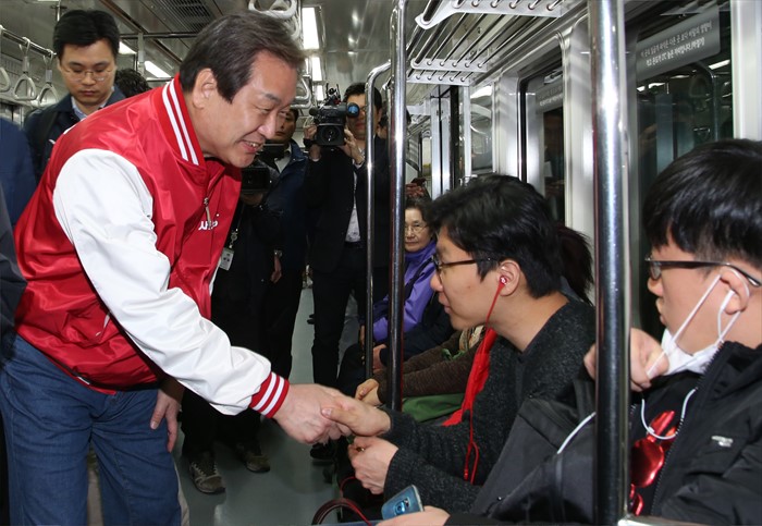 (서울=포커스뉴스) 20대 총선 공식선거 운동이 시작된 31일 오후 지원 유세에 나선 김무성(왼쪽) 새누리당 공동선대위원장이 지하철 6호선