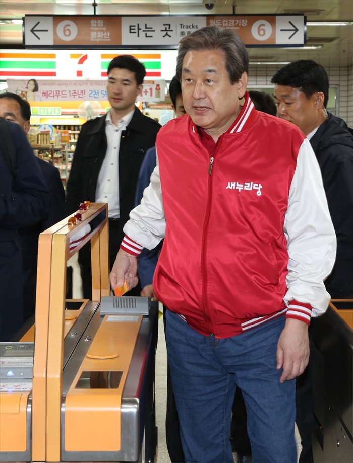 (서울=포커스뉴스) 20대 총선 공식선거 운동이 시작된 31일 오후 지원 유세에 나선 김무성 새누리당 공동선대위원장이 지하철 6호선을 이용한 뒤 나서고 있다. <사진제공=새누리당>