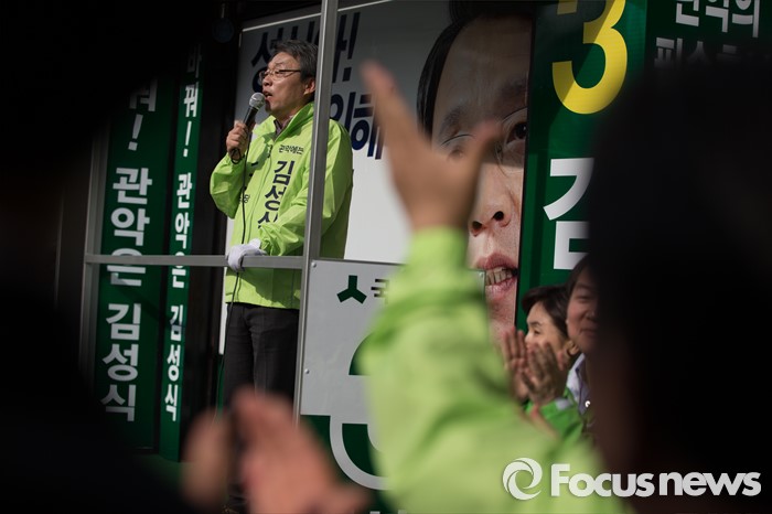(서울=포커스뉴스) 총선 선거운동이 공식적으로 시작된 31일 오후 김성식 국민의당 관악갑 후보가 서울 관악구 관악플라자 앞에서 선거 유세를 하고 있다.