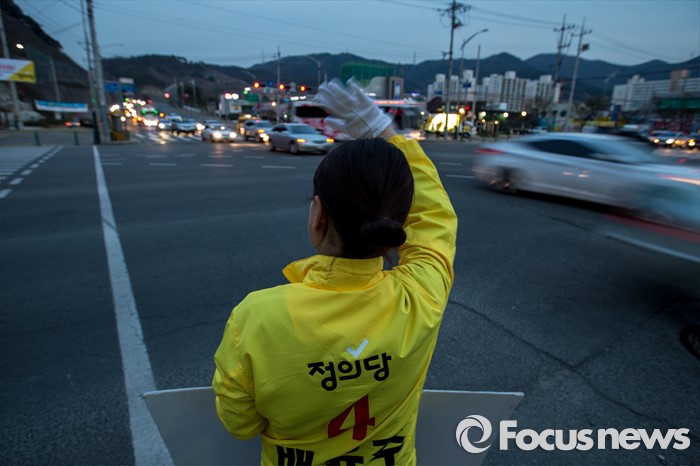 (경산=포커스뉴스) 정의당 경북 경산시 배윤주 후보가 31일 오후 경북 경산시 중앙병원 네거리에서 유권자들에게 한 표를 호소 하고 있다.