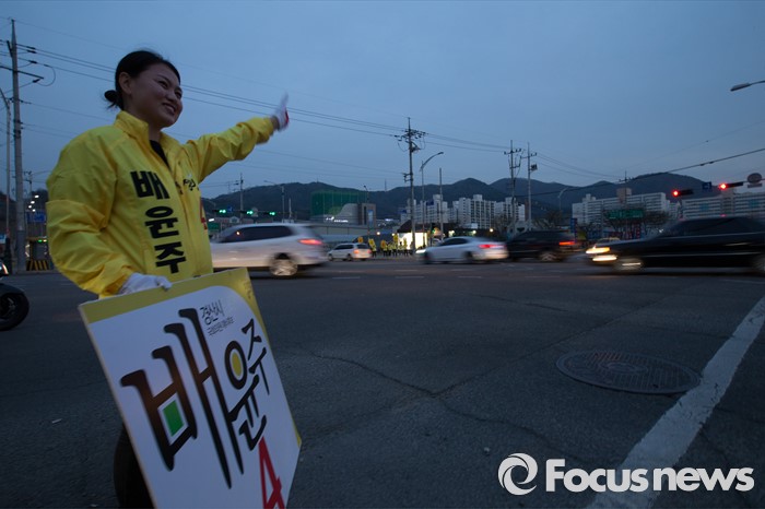 (경산=포커스뉴스) 정의당 경북 경산시 배윤주 후보가 31일 오후 경북 경산시 중앙병원 네거리에서 유권자들에게 한 표를 호소 하고 있다.