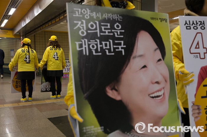 (고양=포커스뉴스) 1일 오전 고양시 덕양구 삼송역에서 심상정 정의당 대표 고양갑 후보가 출근길 선거유세를 하고 있다.