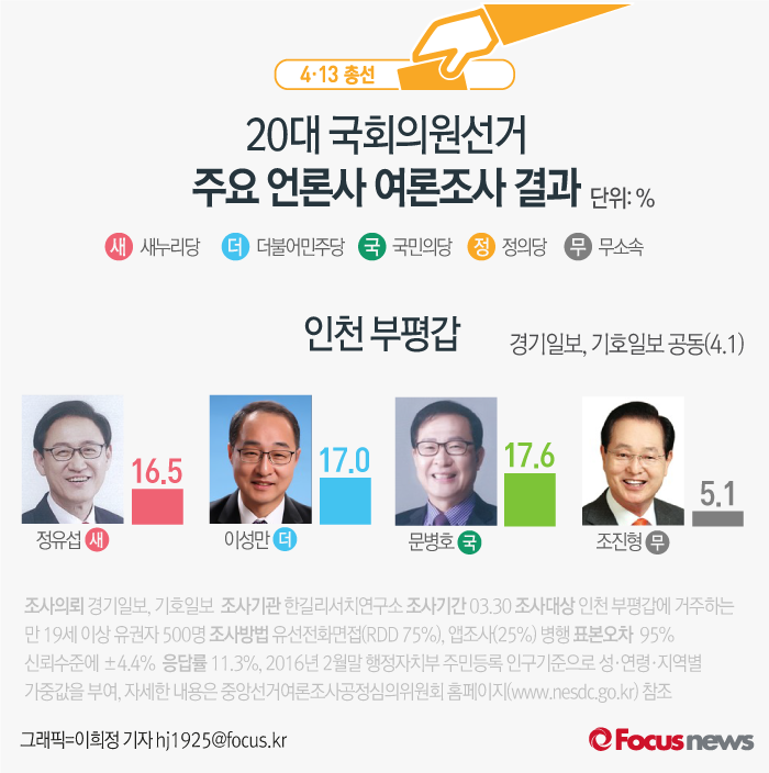 (서울=포커스뉴스) 경기일보, 기호일보가 한길리서치연구소에 의뢰해 1일 발표한 여론조사 결과에 따르면 새누리당 정유섭 후보의 지지율은 16.5%, 더불어민주당 이성만 후보의 지지율은 17.0%, 국민의당 문병호 후보는 17.6%, 무소속 조진형 후보는 5.1%를 기록했다.