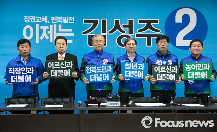(전주=포커스뉴스) 1일 오전 김성주 더불어민주당 전북 전주병 후보 선거사무소에서 열린 중앙당선거대책위원회의에 참석한 김종인 비대위 대표 겸 선대위원장 등 참석자들이 피켓을 들고 구호를 외치고 있다. 왼쪽부터 이석행, 송현섭 부위원장, 김 대표, 김 후보, 최형재 전주을 후보, 박희승 남원·임실·순창 후보.