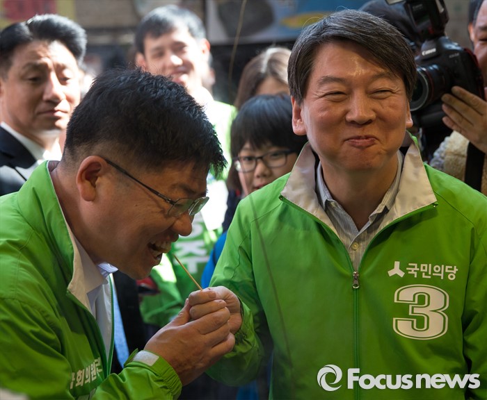 (안양=포커스뉴스) 안철수 국민의당 상임공동대표가 1일 오전 안양시 동안구 중앙시장에서 백종주 동안구갑 후보와 핫바를 먹고 있다.