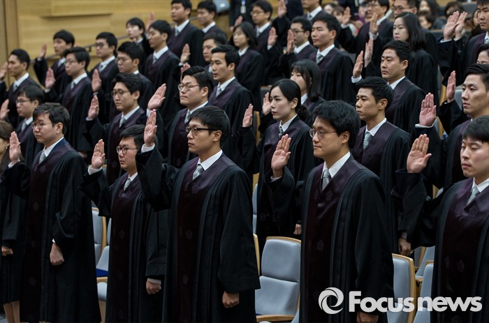 (서울=포커스뉴스) 1일 오전 서울 서초구 대법원 대강당에서 열린 신임 법관 임명식에 참석한 신임 법관들이 선서하고 있다.