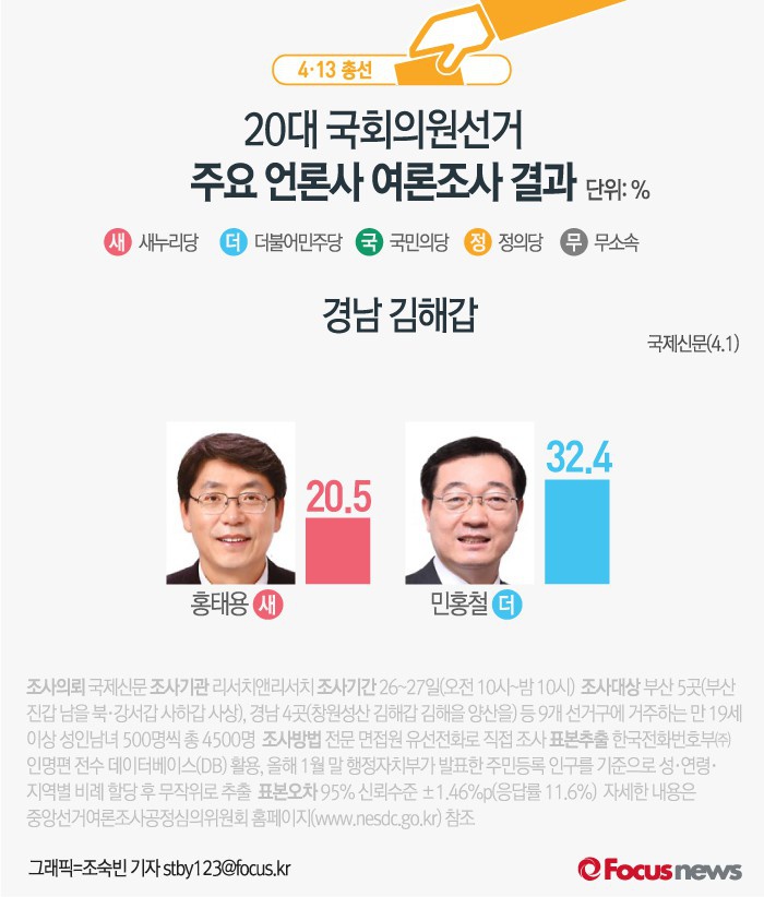(서울=포커스뉴스) 국제신문이 지난 26, 27일(오전 10시~ 밤 10시) 여론조사 전문기관인 ㈜리서치앤리서치에 의뢰해 경남 4곳(창원성산 김해갑 김해을 양산을) 선거구당 유권자 500명씩을 대상으로 여론조사를 실시한 결과, 김해갑의 새누리당 홍태용 후보의 지지율과 더민주 김경수 후보 지지율이 각각 20.5%, 32.4%인 것으로 나타났다.