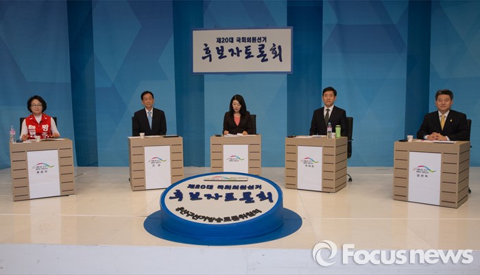 (서울=포커스뉴스) 1일 오전 서울 마포구 서강대 스튜디오에서 제20대 국회의원선거 용산구 후보자들이 지역 케이블 토론회 준비를 하고 있다. 왼쪽부터 황춘자 새누리당 후보, 진영 더불어민주당 후보, 사회자, 곽태원 국민의당 후보, 정연욱 정의당 후보.