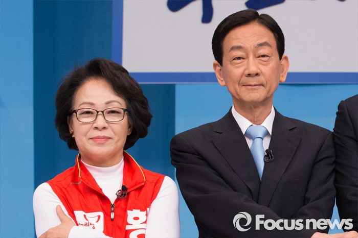 (서울=포커스뉴스) 1일 오전 서울 마포구 서강대 스튜디오에서 제20대 국회의원선거 용산구 후보자 토론회 시작 전 황춘자(왼쪽) 새누리당 후보, 진영 더불어민주당 후보가 포토타임을 갖고 있다.