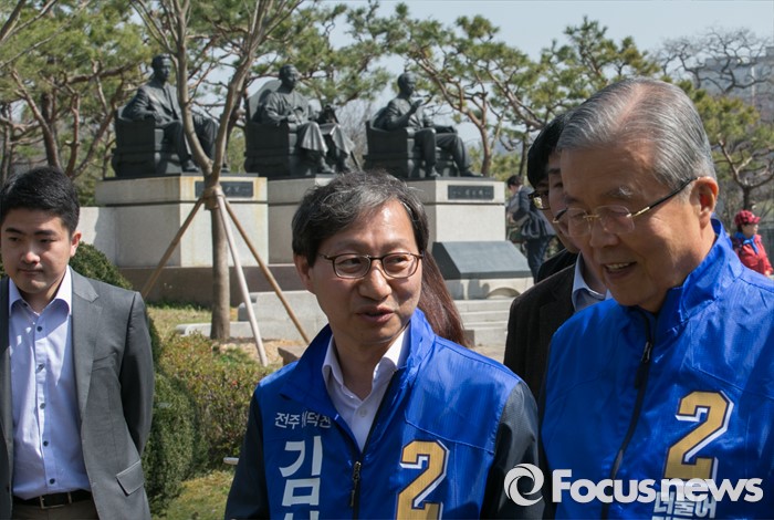 (전주=포커스뉴스) 1일 오전 전북 전주시 덕진공원을 방문한 김종인(오른쪽) 더불어민주당 비대위 대표 겸 선대위원장과 김성주 전주병 후보가 김 대표의 조부인 가인 김병로 선생 등 '법조 3성' 동상을 둘러본 뒤 이동하고 있다.