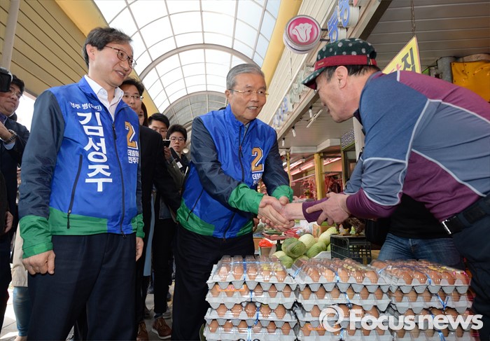 (전주=포커스뉴스) 1일 오전 전북 전주 모래내시장을 방문한 김종인 더불어민주당 비대위 대표 겸 선대위원장과 김성주 전주병 후보가 상인들과 인사하며 지지를 호소하고 있다.