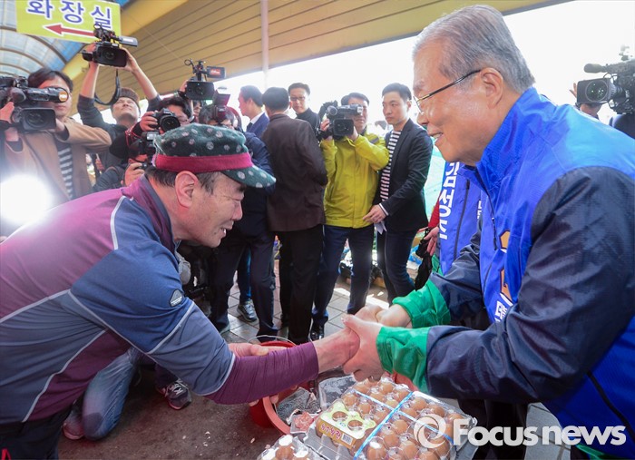 (전주=포커스뉴스) 1일 오전 전북 전주 모래내시장을 방문한 김종인 더불어민주당 비대위 대표 겸 선대위원장과 김성주 전주병 후보가 상인들과 인사하며 지지를 호소하고 있다.
