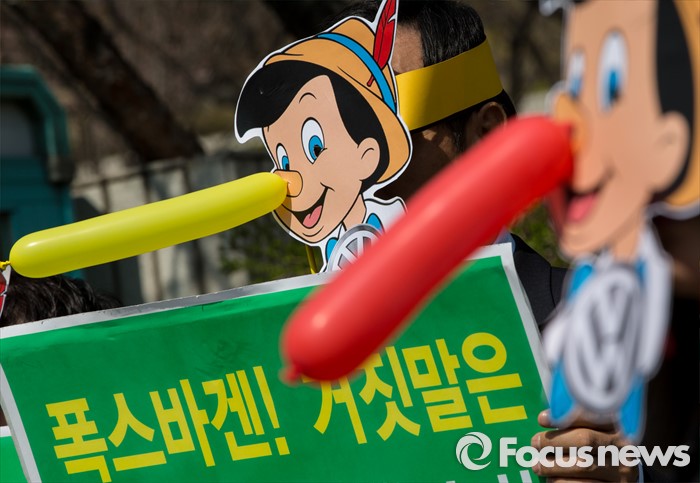 (서울=포커스뉴스) 1일 오전 서울 서초구 서울중앙지법에서 피노키오 탈을 쓴 서민민생대책위원회, 서울환경연합 회원들이 '아우디ㆍ폭스바겐 규탄 및 피해보상 촉구' 기자회견을 열고 있다.