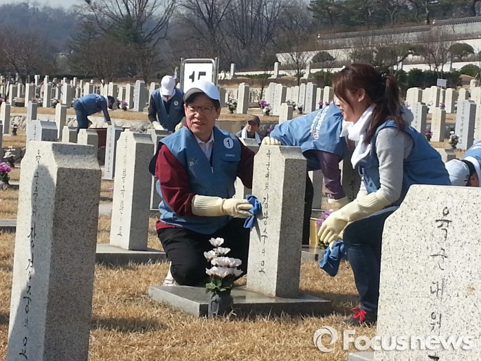 간략한 언론 인터뷰를 마친 권 회장과 임직원들은 본격적인 봉사활동 준비를 했다. 검은 정장을 벗고 '포스코패밀리봉사단'이라고 적힌 파란색 조끼로 갈아입었다. 봉사활동은 5개조로 나뉘어 박 명예회장 묘역에서 한 블록 아래에 위치한 15묘역과 17묘역에서 진행됐다.