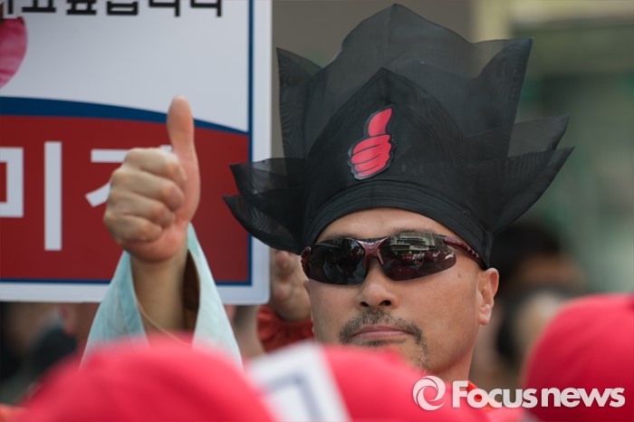 (수원=포커스뉴스) 1일 오전 경기도 수원시 팔달구 수원역 로데오거리 입구에서 한 지지자가 새누리당 수원지역 후보자 합동 유세에 참석해, 엄지를 들어보이고 있다.