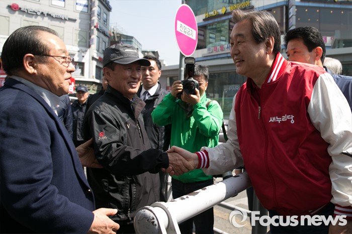 (수원=포커스뉴스) 1일 오전 경기도 수원시 팔달구 수원역 로데오거리 입구에서 열린 새누리당 수원지역 후보 합동유세에 참석한 김무성 새누리당 대표가 시민들과 악수하고 있다.