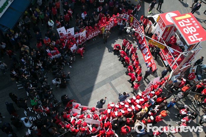 (수원=포커스뉴스) 1일 오전 경기도 수원시 팔달구 수원역 로데오거리 입구에서 새누리당 수원지역 후보자 합동 유세가 열리고 있다.