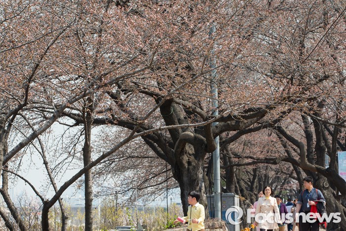(서울=포커스뉴스) 봄 기운이 완연한 1일 오후 서울 여의도 윤중로를 찾은 시민들이 꽃망울을 머금은 벚나무 사이로 산책을 즐기고 있다.