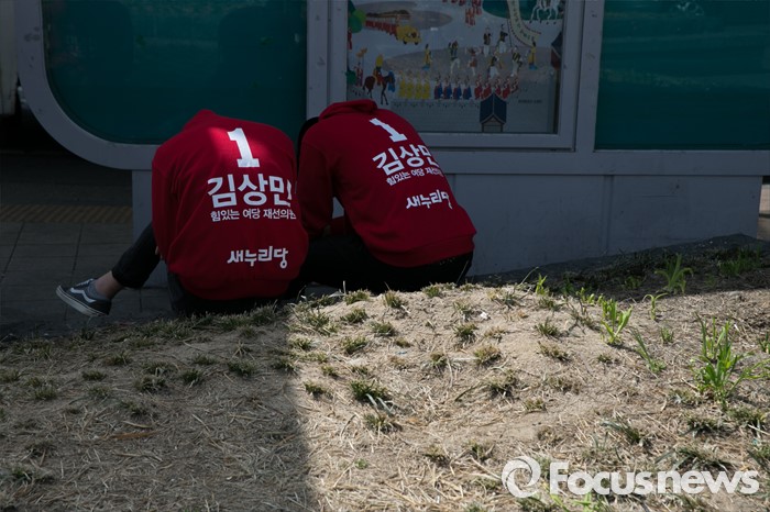 (수원=포커스뉴스) 1일 오전 경기도 수원시 팔달구 수원역 로데오거리 입구에서 새누리당 선거운동원들이 수원지역 후보자 합동 유세에 참석해, 더위를 피해 그늘에서 잠시 쉬고 있다.