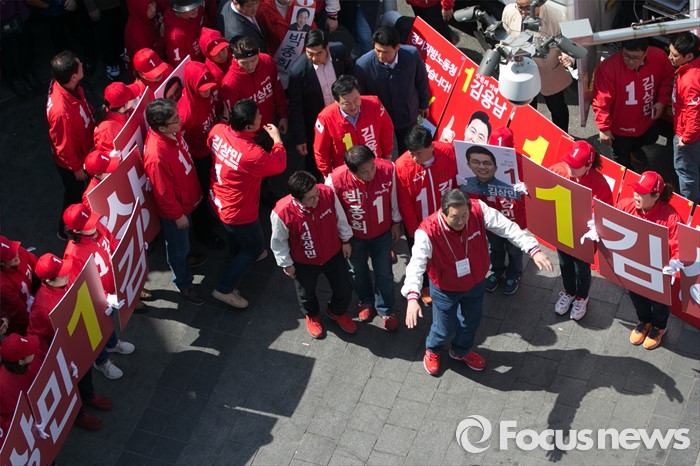 (수원=포커스뉴스) 김무성(맨 앞) 새누리당 대표가 1일 오전 경기도 수원시 팔달구 수원역 로데오거리 입구에서 열린 새누리당 수원지역 후보자 합동 유세에 참석하고 있다.