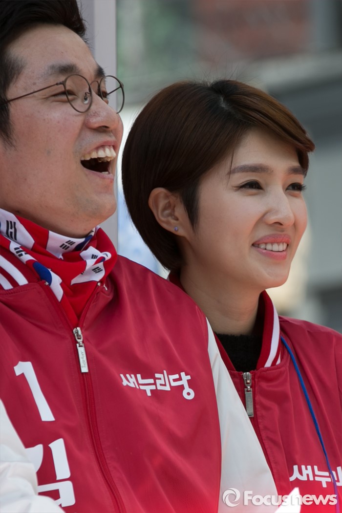 (수원=포커스뉴스) 김상민(왼쪽) 새누리당 수원을 후보와 부인 김경란 전 아나운서가 1일 오전 경기도 수원시 팔달구 수원역 로데오거리 입구에서 열린 새누리당 수원지역 후보자 합동 유세에 참석해, 지지를 호소하고 있다.