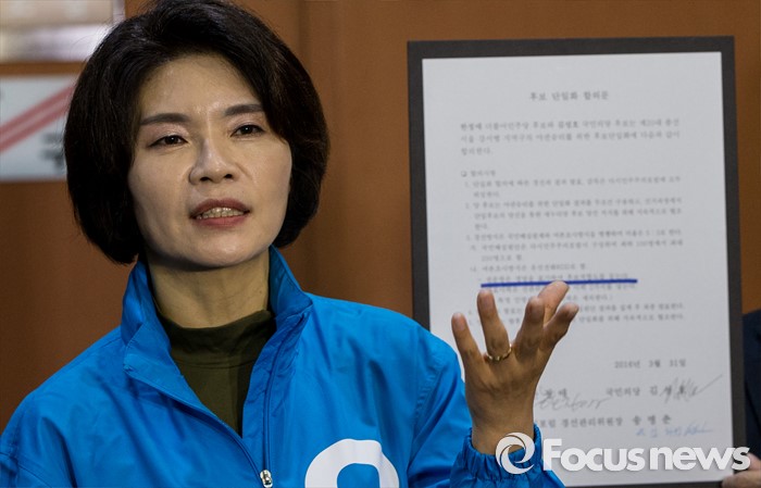 (서울=포커스뉴스) 한정애 더불어민주당 강서병 후보가 1일 오후 서울 여의도 국회 정론관에서 국민의당 김성호 후보와 단일화에 대한 기자회견을 하고 있다. 서울 강서병 지역 한정애 더민주 후보, 김성호 국민의당 후보 간의 단일화는 첫 수도권 단일화 합의로 관심을 모았으나 당명 사용 문제가 해결되지 않아 진통을 겪을 예상이다.
