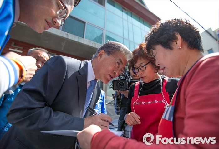 (서울=포커스뉴스) 1일 오후 문재인 전 더불어민주당 대표가 서울 은평구 역촌노인복지회관에서 박주민 은평갑 후보와 함께 유세를 하고 있다.