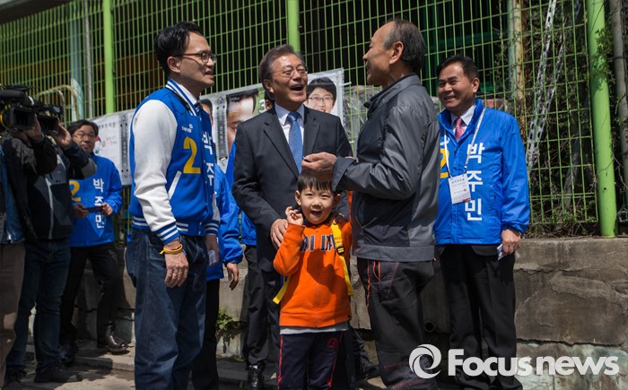 (서울=포커스뉴스) 1일 오후 문재인 전 더불어민주당 대표가 서울 은평구 역촌노인복지회관 인근에서 박주민 은평갑 후보와 함께 유세를 하고 있다.