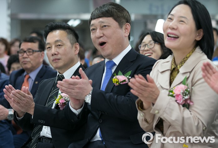 (익산=포커스뉴스) 임수경(오른쪽부터), 최재성 더불어민주당 의원과 정봉주 전 의원이 1일 오후 한병도 전북 익산을 후보 선거사무소에서 열린 개소식에 참석해 박수를 치고 있다.