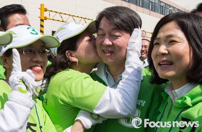 (안산=포커스뉴스) 안철수 국민의당 상임공동대표가 1일 오후 안산시 상록구 상록수역 월드프라자 앞에서 김영환 상록구을 후보와 박주원 상록구갑 후보 지원 유세를 하던 중 한 선거운동원에게 입맞춤을 받고 있다