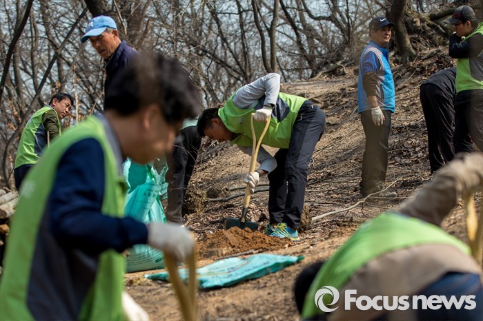 (서울=포커스뉴스) 1일 오후 서울 동대문구 배봉산에서 동대문구청 직원들이 식목일을 앞두고 나무를 심고 있다.